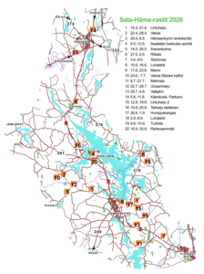 Ajanotto: Ajanotollisilla kerroilla Emit-leimausjärjestelmällä, omatoimirasteilla ei ole ajanottoa.